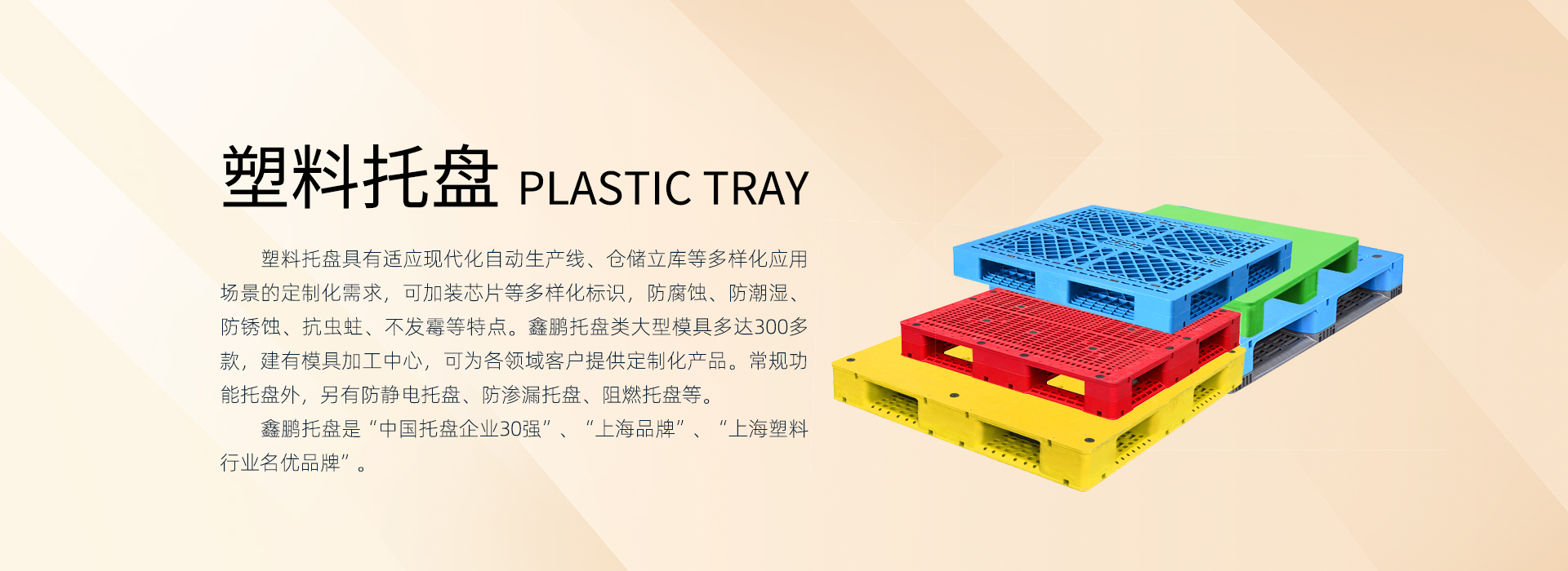 上海鑫鵬塑料創始于1987年,始終專注深根塑料產業鏈,業務板塊包括:塑料原料貿易、塑料制品研發制造(塑料托盤、塑料箱筐、卡板箱、環衛桶等)。現全國有5個生產基地:上海2個、四川1個、江蘇2個。